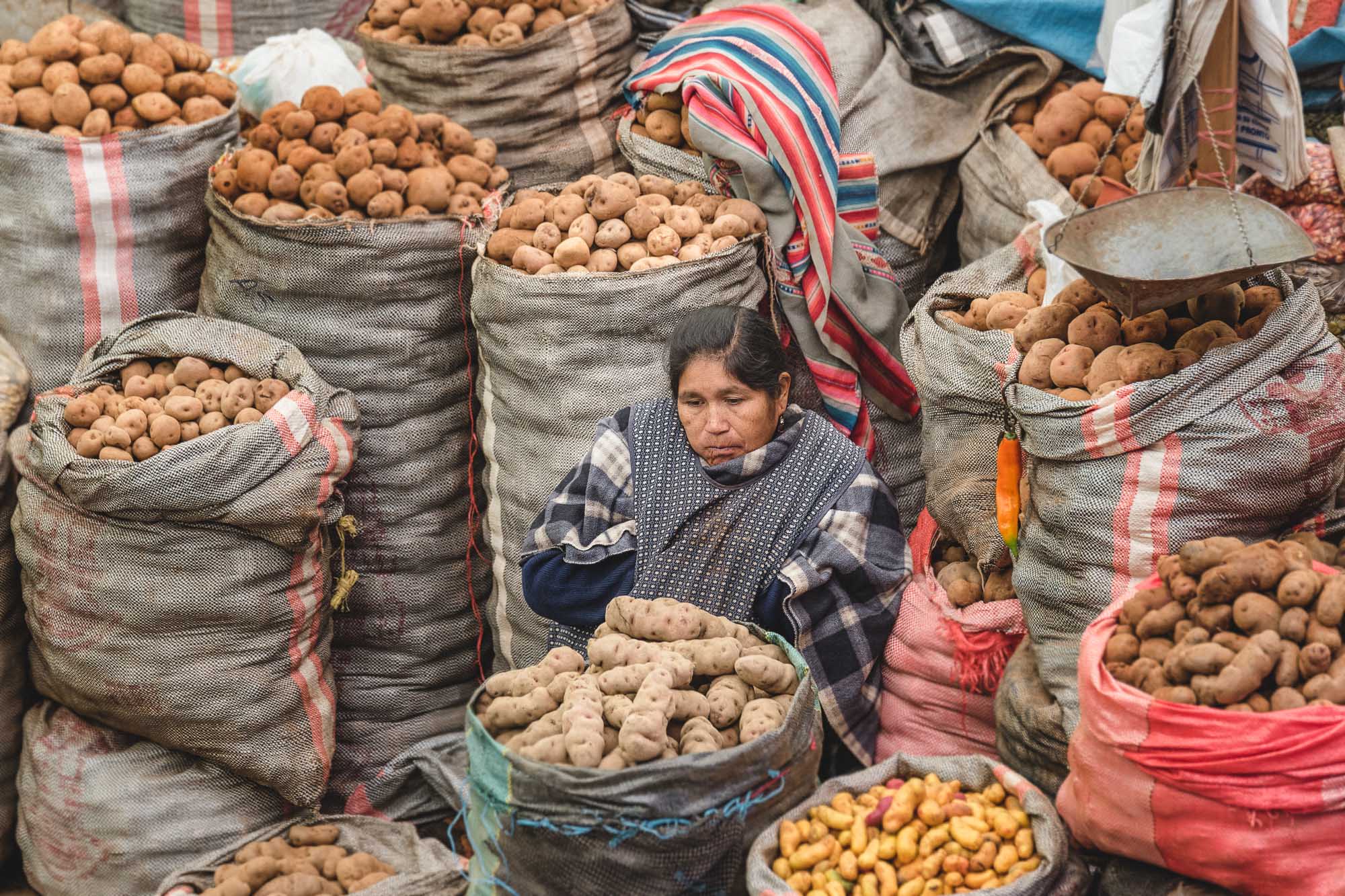 Le Pérou est réputé pour sa grande diversité de variétés de pommes de terre, avec des milliers de types différents cultivés dans tout le pays, chacun ayant des caractéristiques uniques de taille, de forme, de couleur et de goût. Les variétés de pommes de terre péruviennes vont des petites et colorées papas nativas aux plus grandes et plus farineuses papas amarillas. Il n'est alors pas du tout étonnant dans retrouver a foison dans les hall de marché.