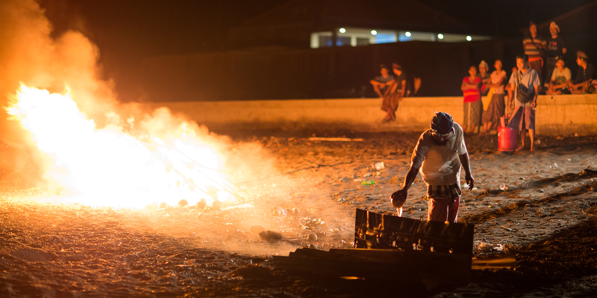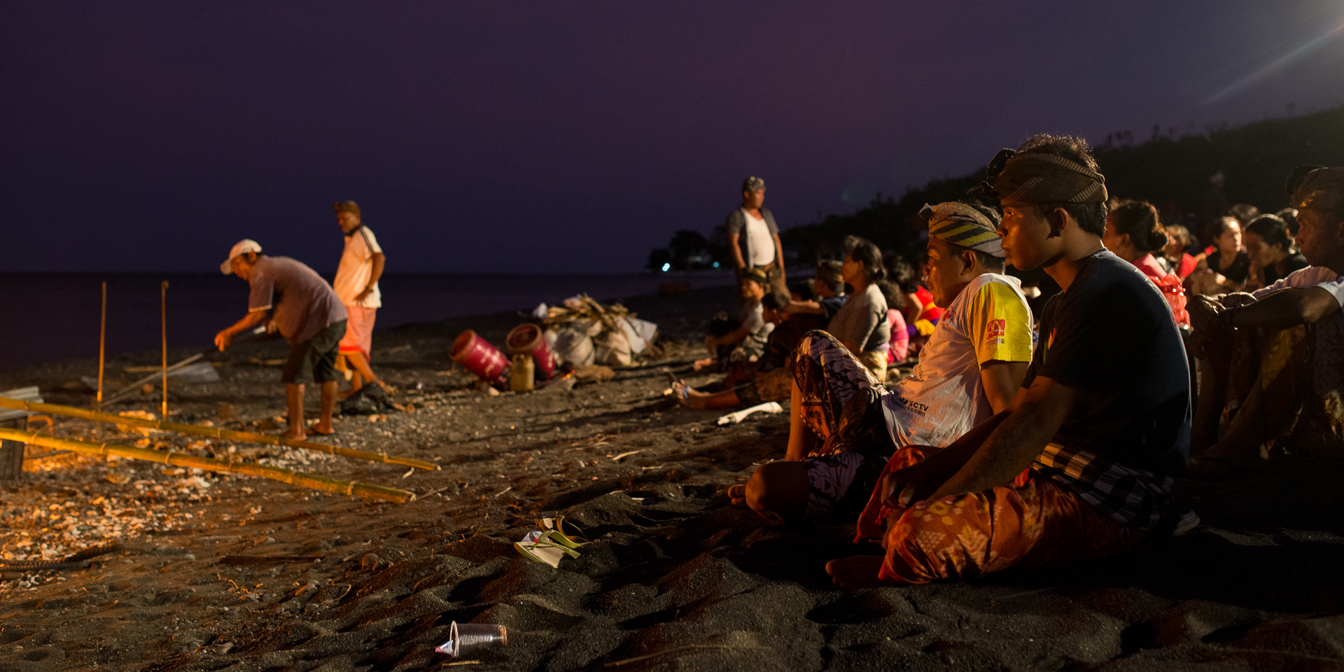 Les cérémonies sont très importantes dans la culture balinaise et en marchant le long de la plage au coucher du soleil, je suis passé devant un groupe de locaux assis là et regardant un grand feu face à la mer. Par curiosité, je me suis assis avec eux, et j'ai vite réalisé qu'il y avait toute une communauté autour de moi, peut-être 100 personnes. J'ai commencé à prendre quelques photos mais je ne voulais pas être impoli ou irrespectueux concernant la cérémonie alors j'ai essayé de trouver quelqu'un parlant anglais autour de moi pour avoir plus d'informations sur ce qui se passait. Je trouve enfin quelqu'un capable de m'expliquer ce à quoi j'étais témoin. C'était la crémation d'un membre de la communauté. Je partage avec vous quelques clichés intimistes que j'ai pu prendre dans le respect de la cérémonie et de la communauté.