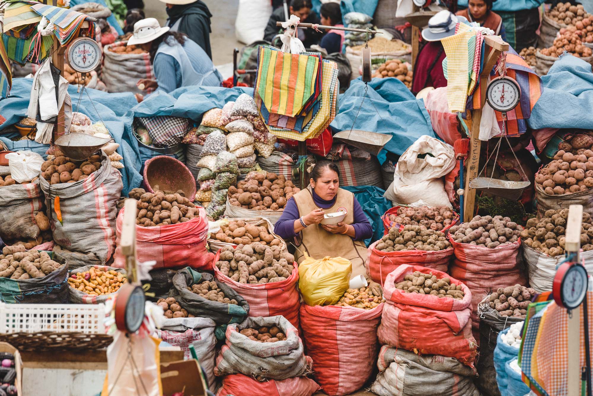 Le Pérou est réputé pour sa grande diversité de variétés de pommes de terre, avec des milliers de types différents cultivés dans tout le pays, chacun ayant des caractéristiques uniques de taille, de forme, de couleur et de goût. Les variétés de pommes de terre péruviennes vont des petites et colorées papas nativas aux plus grandes et plus farineuses papas amarillas. Il n'est alors pas du tout étonnant dans retrouver a foison dans les hall de marché.